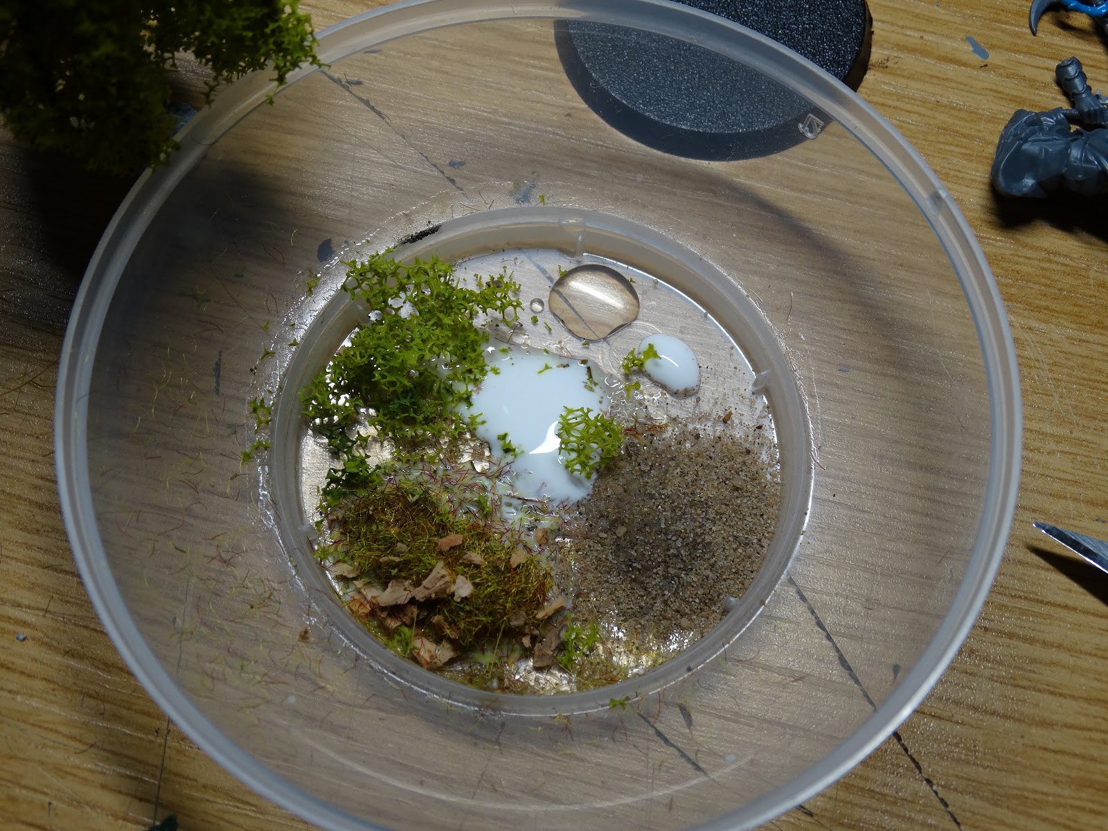 For the next layer I mixed fine sand, static grass with cork 'stones', flock from a model tree, PVA glue and water.